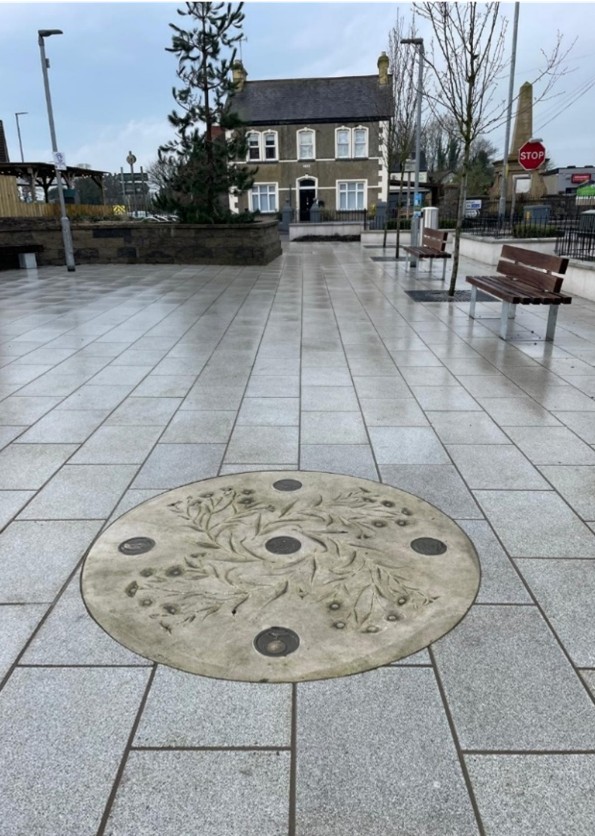 The historically based sculptural intervention chosen for the town square has enhanced the relatively small space and given much needed breathing space for the artwork. The engraved Donegal stone circle with bronze inserts sits comfortably within new and contrasting paving.