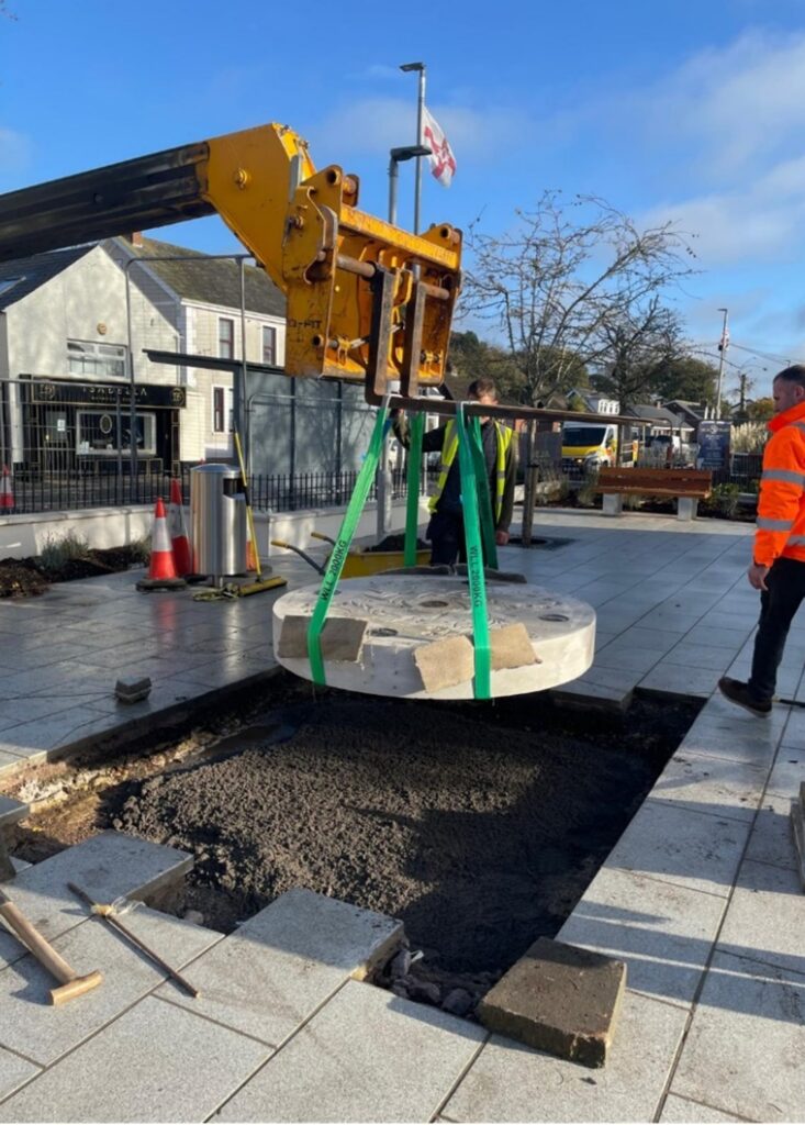 The Flax Flower Relief references the history and significance of linen making in the area allowing it to flourish. Inlaid into this relief are five bronze discs. One disc in the centre and four others around it. The discs have a have a typical bronze finish located externally and imply treasure, something important and precious. Bronze is appropriate as it is hard wearing and there is evidence of settlements in Dough from the bronze age represented by the ‘Holestone’, a bronze age megalith just outside Doagh. Each disc will represent an element of Doagh’s history